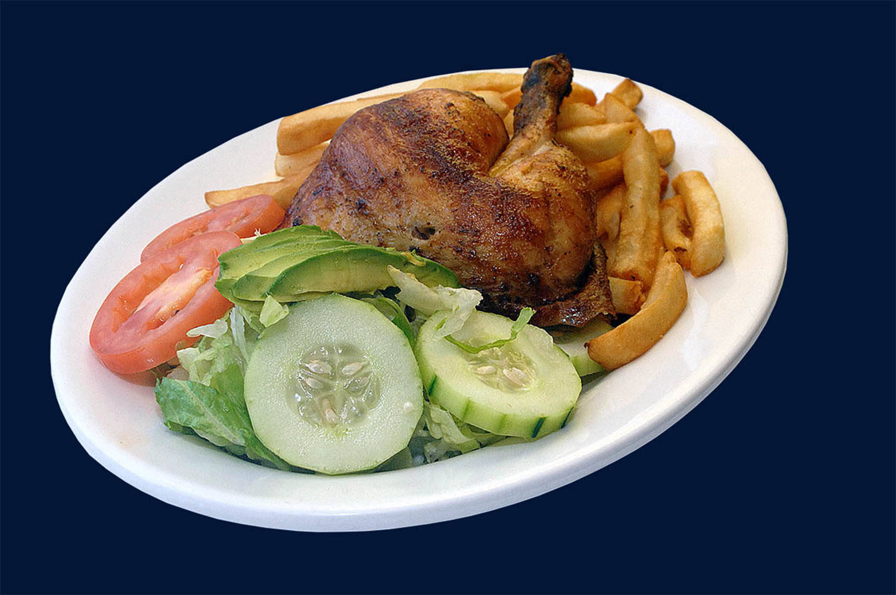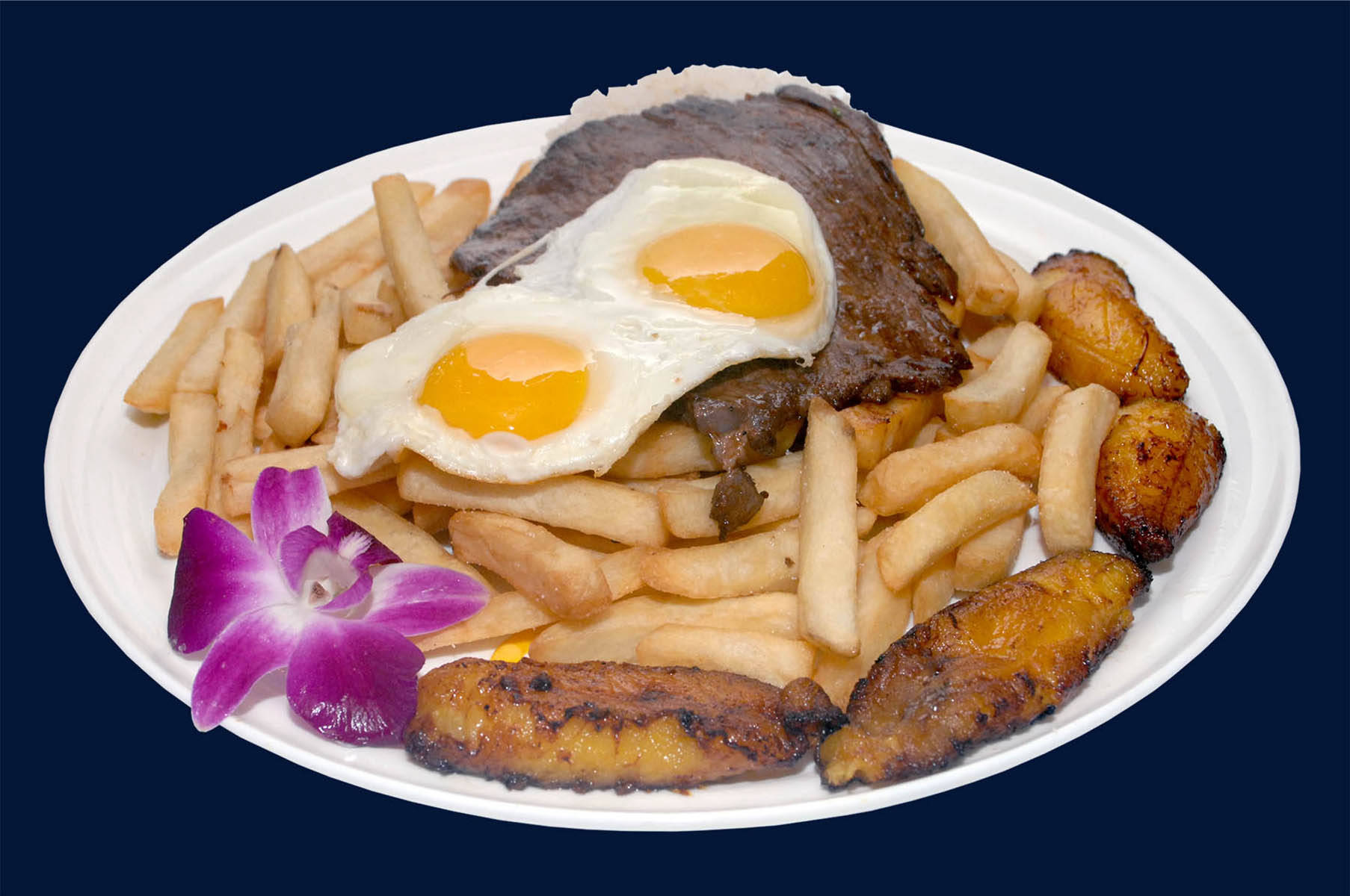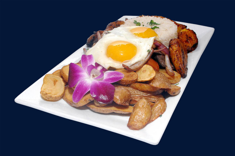 Pan fried rice and beans served with steak, fried eggs, sweet plantains and salsa criolla